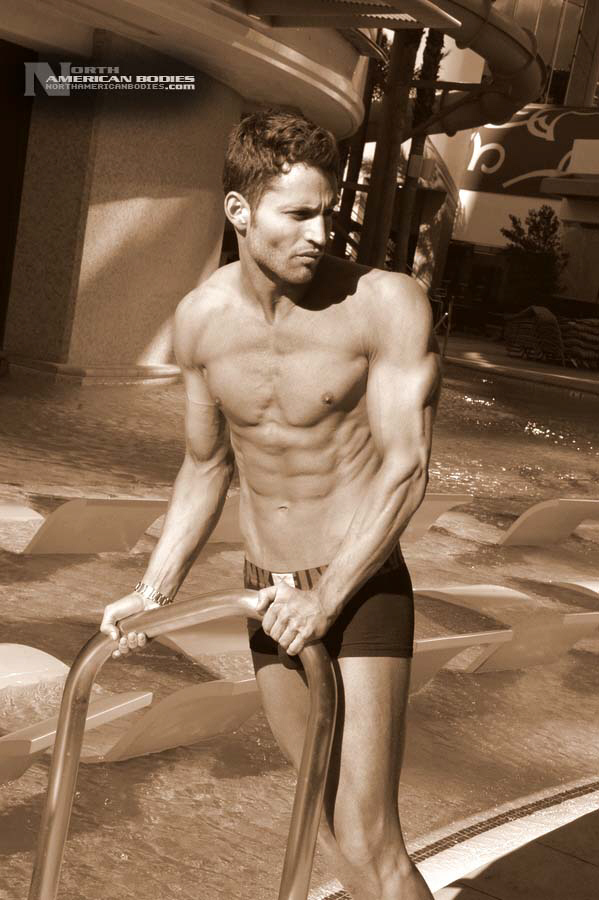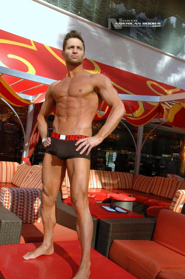 Jeff Tsoutsos is a 29 year old fitness model from South Africa. Jeff stands 5″11″ tall and competes at 180 lbs, and gets up to 190 lbs. in the off season. His biceps measure 18″, waist 31″, chest 40″, quads 25″ and calves 20″. Jeff has competed in several fitness modeling competitions, including the Model Championship South Africa in which he took 1st place. He also competed at the Model America Championship held in Las Vegas in which he placed 10th overall and 2nd in swimwear. Jeff has an active sports background, including surfing, soccer, swimming, rugby, muay thai, karate and grappling. He has been training steadily for ten years, at one stage hitting 210 lbs and doing proper bodybuilding, but Jeff realized it wasn’t for him since he has more of a fighters/swimmer build, so Jeff leaned down. His goal when stepping on stage is, even though he may not carry a lot of mass, to be the hardest and most ripped. One of the reasons for leaning down and not staying bulked is so that he could do commercial modeling. His modeling background is quite extensive, from catalogues, swimwear and television commercials to fitness modeling. Jeff is also a trained actor, and recently lived for a month in Bollywood India shooting the action drama “Crook”. We met and photographed Jeff at the Model America Championships in Las Vegas, and we are very pleased to be able to add Jeff Tsoutsos to our roster of top fitness models and bodybuilders at NorthAmericanBodies.com!
