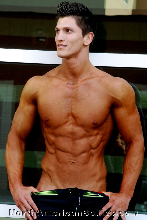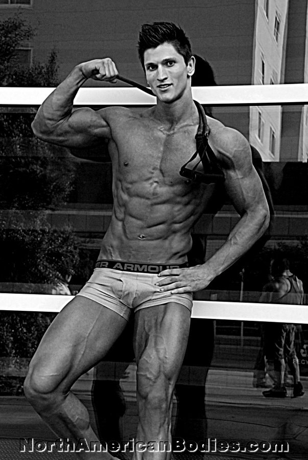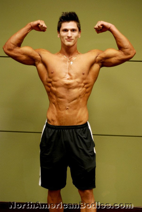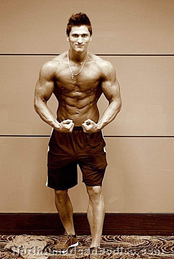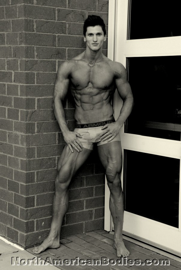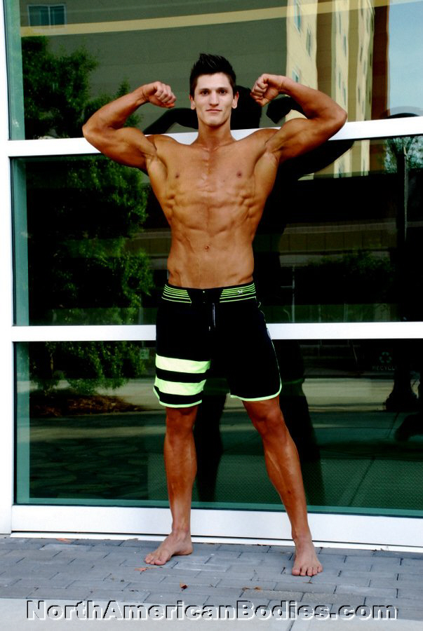 Nate Baumbick is a fitness model from Ohio. He has been an athlete his whole life, playing semi-pro hockey all over the United States and Canada as well as in Russia. He has been training since the age of 16 for hockey, but fitness has always been very important to Nate, turning into a passion. He is 6’3” tall and weighs about 220 pounds when shredded for shoots and competitions, and 240 pounds off-season. His biceps measure 17.5”, quads 27”, waist 36”, chest 46”, and calves 17”. In 2012, Nate entered the NPC Natural Northern USA Championships in the Men’s Physique Division, placing 4th in Class C. He also competed at the 2012 NPC Natural Pennsylvania Championships (1st Place in Class B) and the 2012 Mid Atlantic Grand Prix (1st Place). Nate moved on to the National level, competing in 2013 at the NPC Jr. USA Championships in Charleston, where he took 1st Place in Class F and also earned his IFBB Pro Card. We met and photographed Nate at the Jr. USA, and we are pleased to add Nate Baumbick to our roster of top fitness models and bodybuilders at NorthAmericanBodies.com!